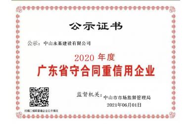 公司荣获2020年度广东省守合同重信用企业证书